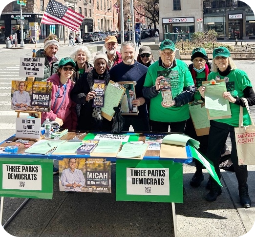 Our Club Three Parks Independent Democrats has been an active participant in Upper West Side politics for fifty years. In addition to endorsing and working for candidates who demonstrate ability, progressive convictions and who will oppose the Trump Coup, we organize phone banks, postcard writing, and canvassing trips to take back Congress and the White House. We participate in rallies, protests, and other events. Join us today to make Three Parks your political home.